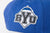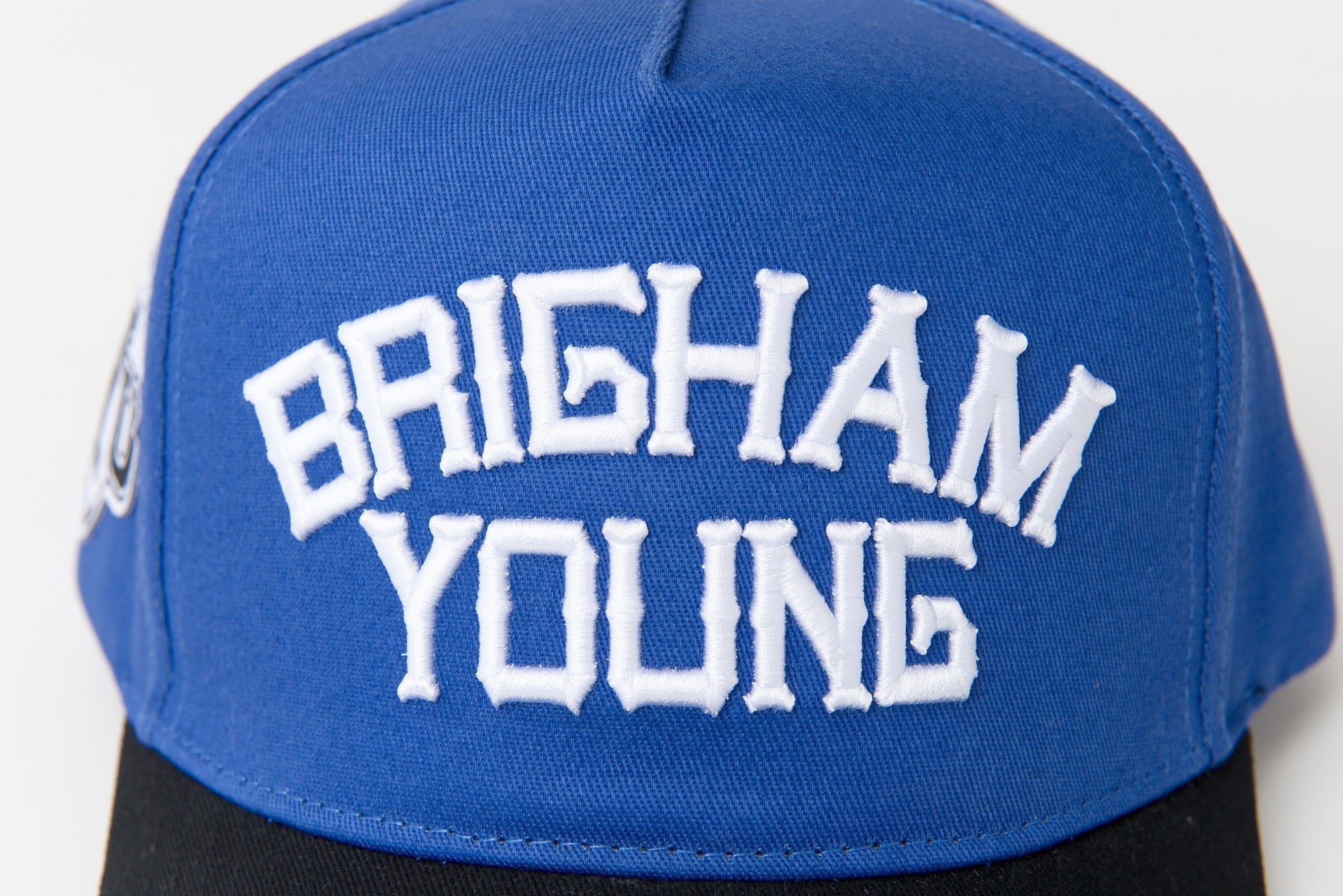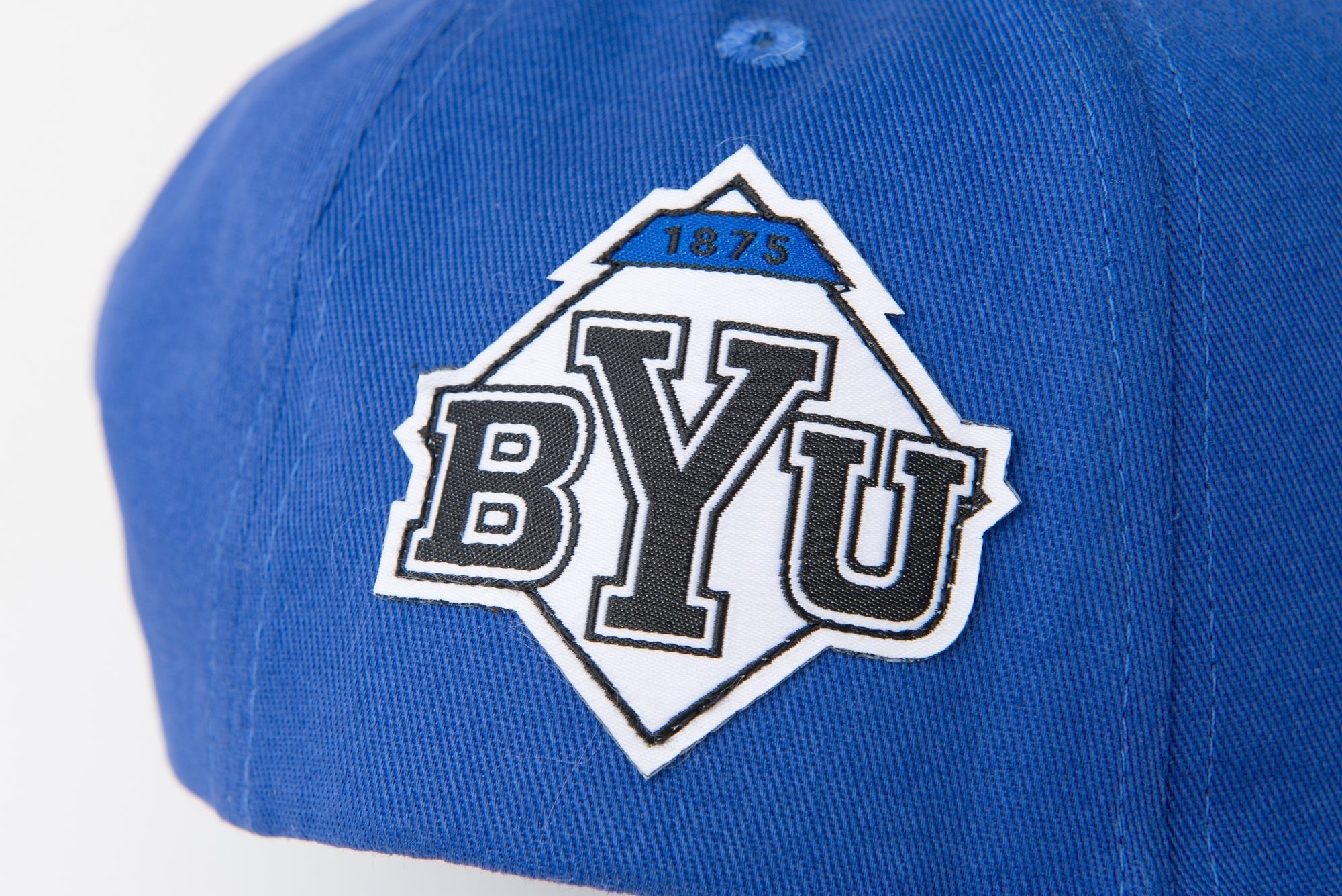 This BYU hat forms a clean look with its royal blue colored crown, matched with a black brim and adorned with a Brigham Young Wordmark in Western font on the front and a custom BYU logo on the side.
