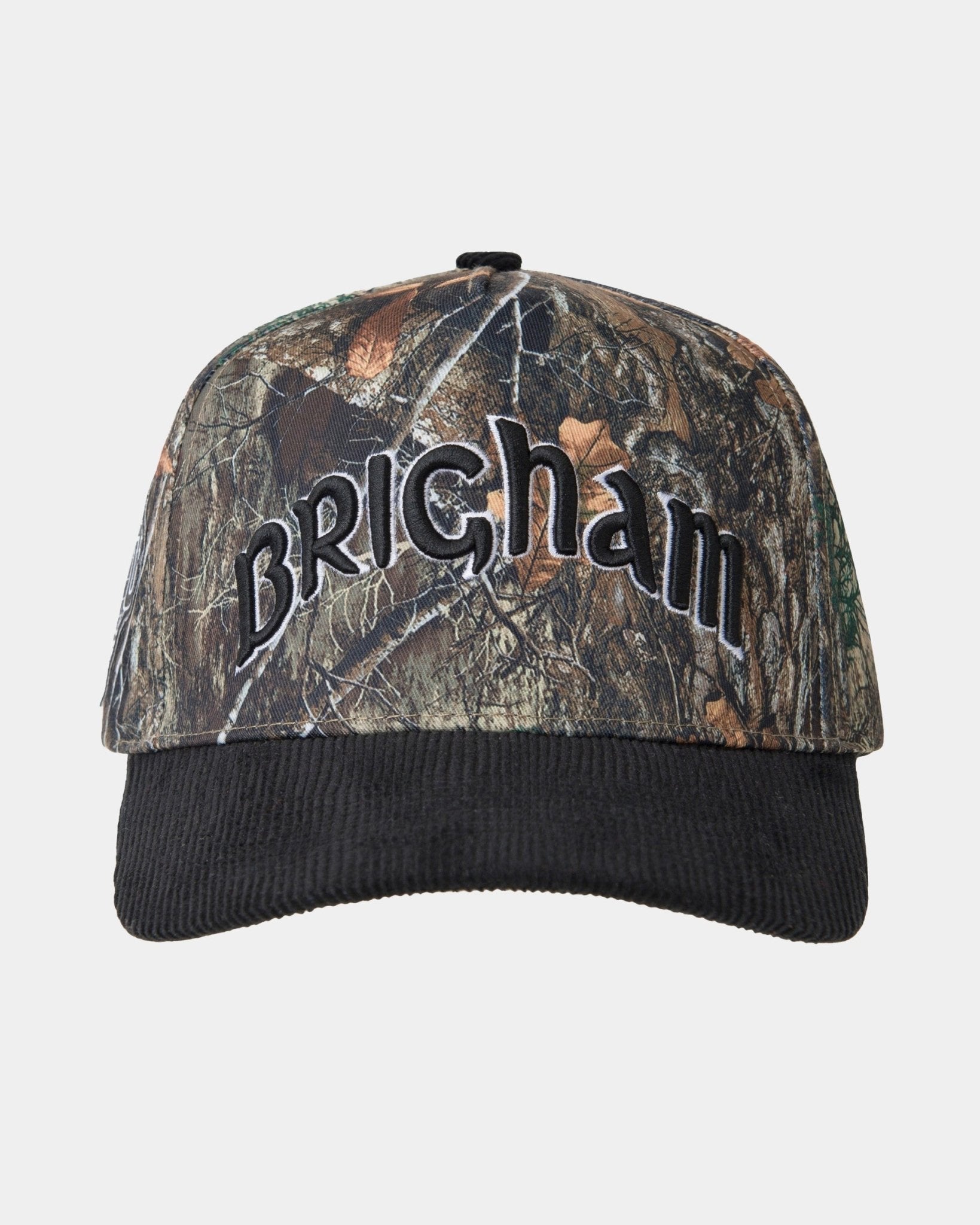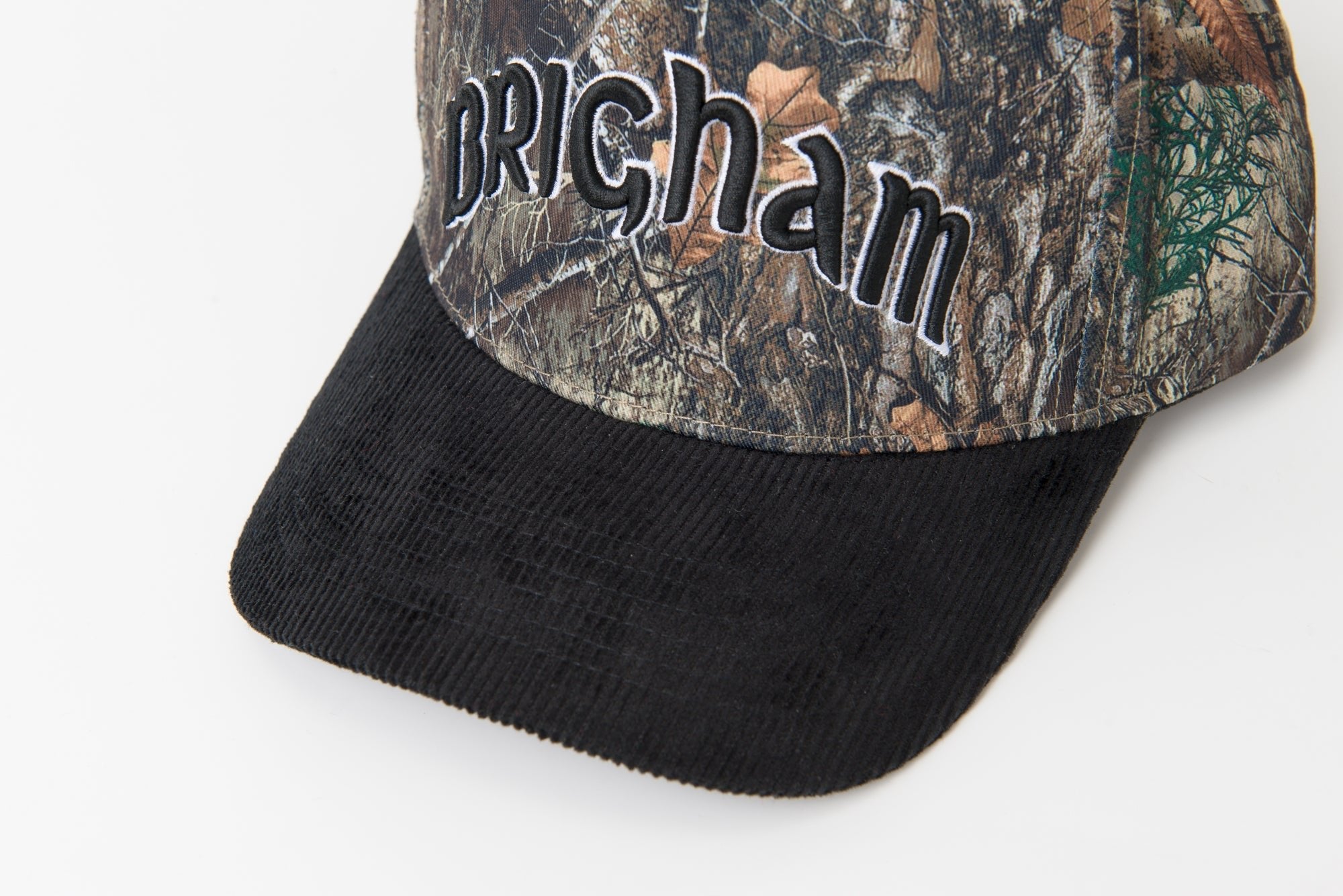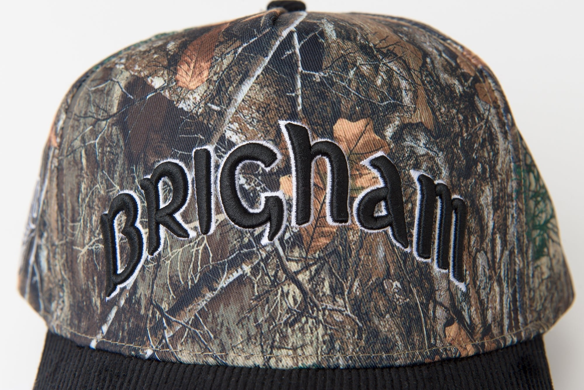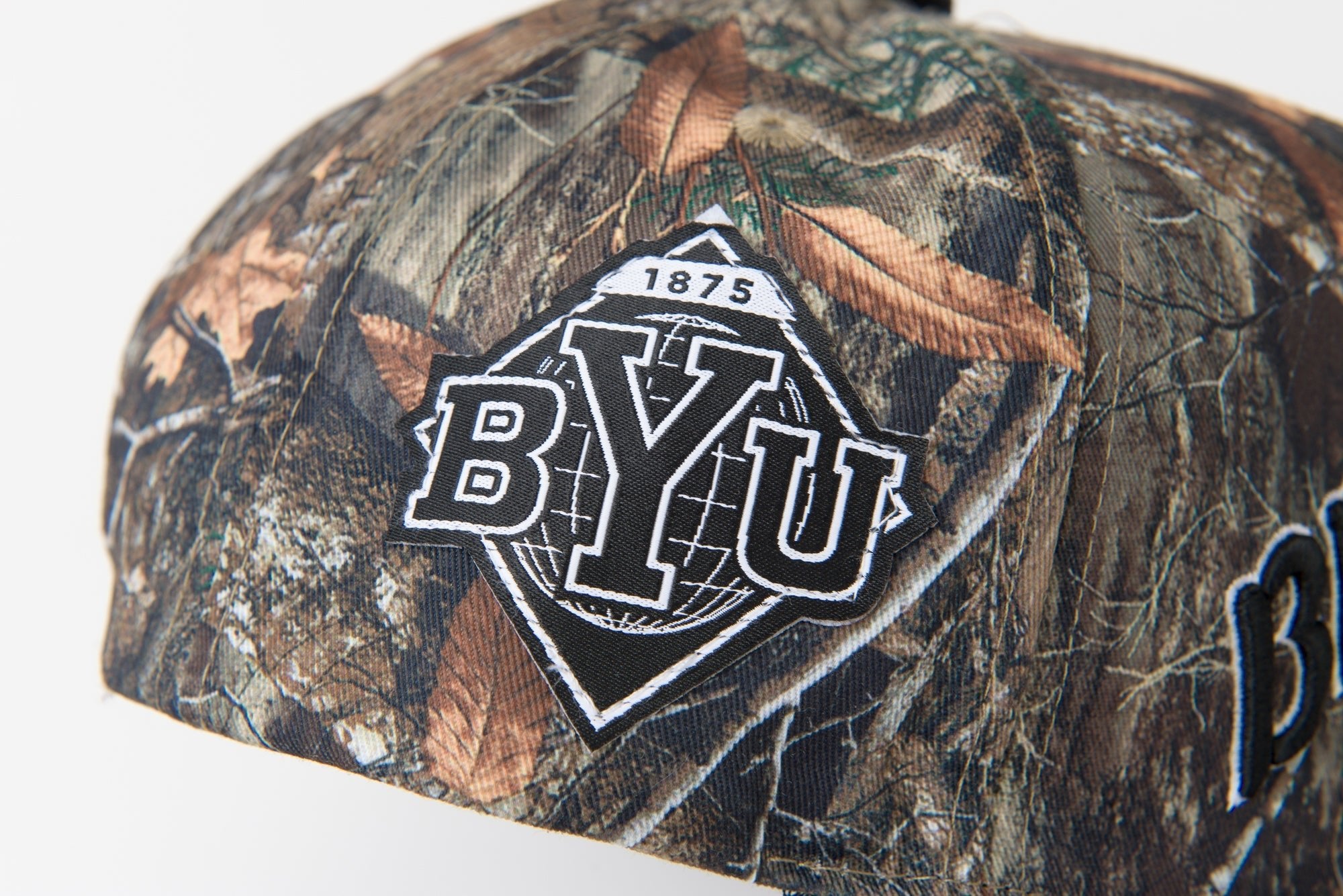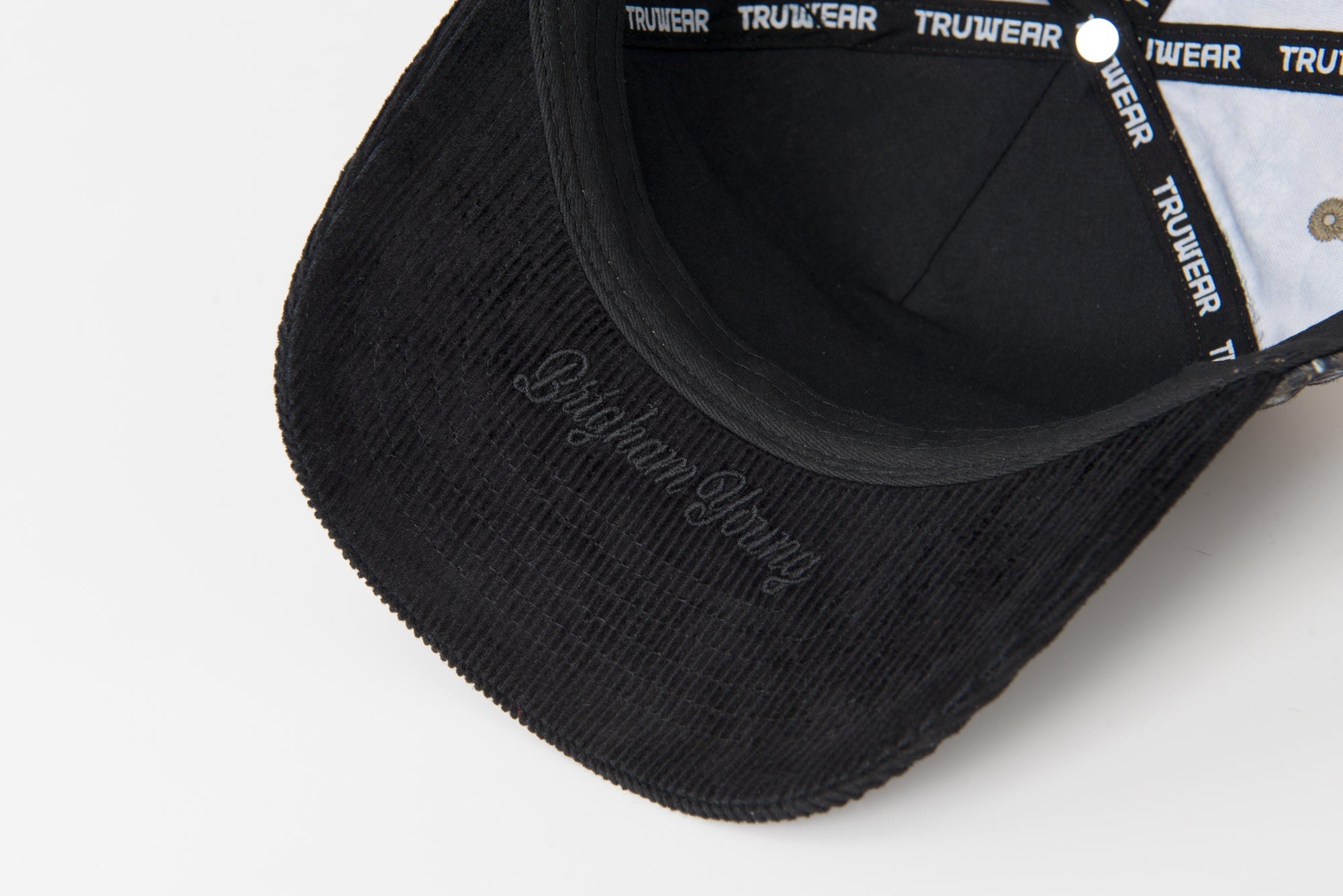 This BYU hat forms a clean look with its camo printed crown, the textured black corduroy brim and adorned with the Gothic font Brigham wordmark on the front and a custom and unique BYU logo on the side.