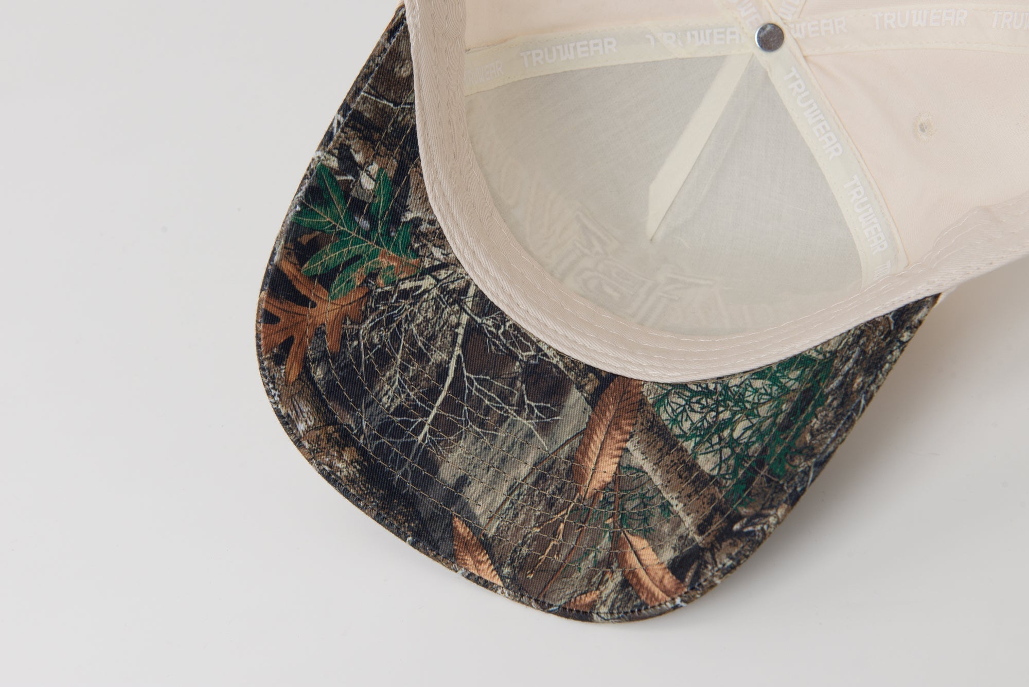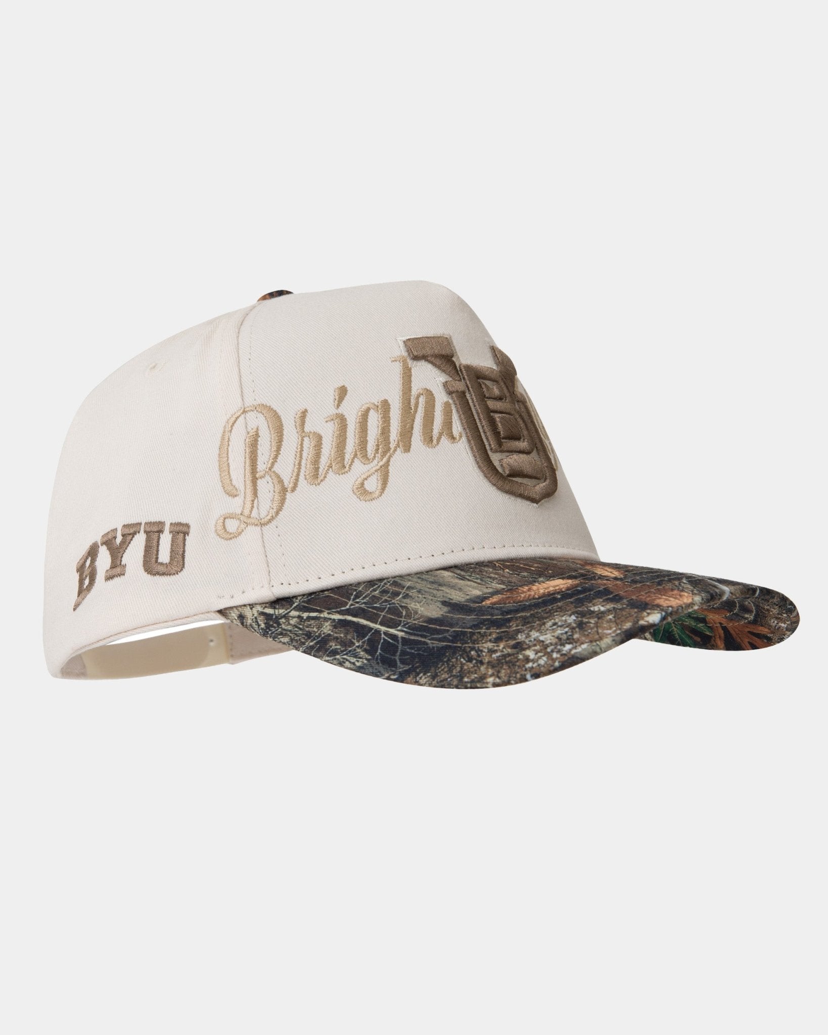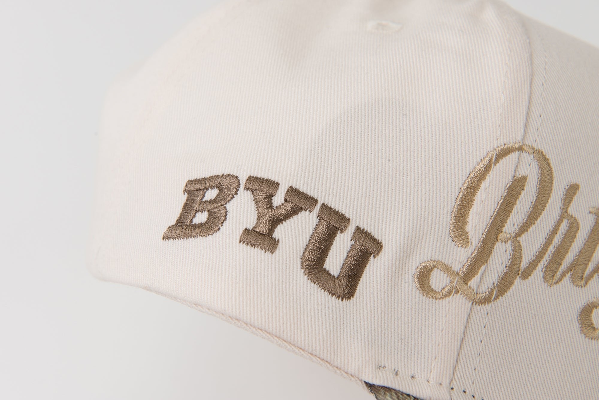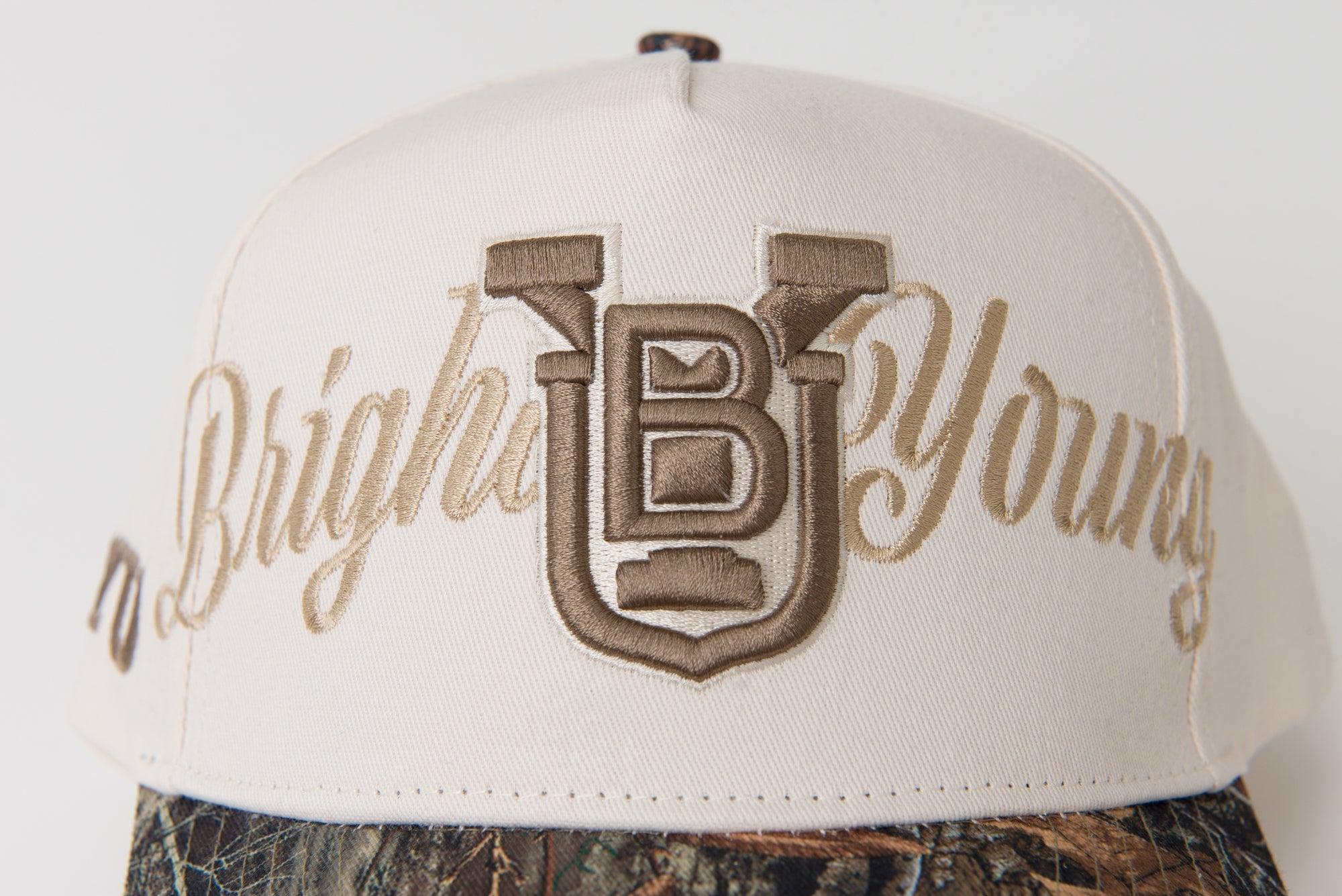 This BYU hat forms a clean look with its cream colored crown, Gold Stitching, a camo print brim and adorned with the OG BYU Stacked letter logo on the front with a cursive Brigham Young behind it and the classic BYU block font on the side.