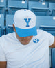 This BYU hat forms a clean look with its white colored crown, the royal blue colored brim and adorned with a Brigham Young gothic font logo on the front and the block BYU logo on the side.