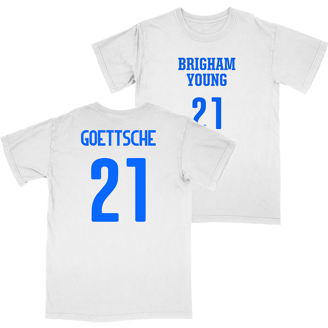 Show your Cougar pride and celebrate one of BYUâs standouts with the Mia Goettsche Womenâs Soccer Jersey Tee. Designed for fans who want to rep their favorite player in comfort and style, this tee combines the look of a jersey with the ease of everyday wear. The front features a bold âBrigham Youngâ chest print, while the back showcases Goettscheâs name and number in the authentic BYU font style.
