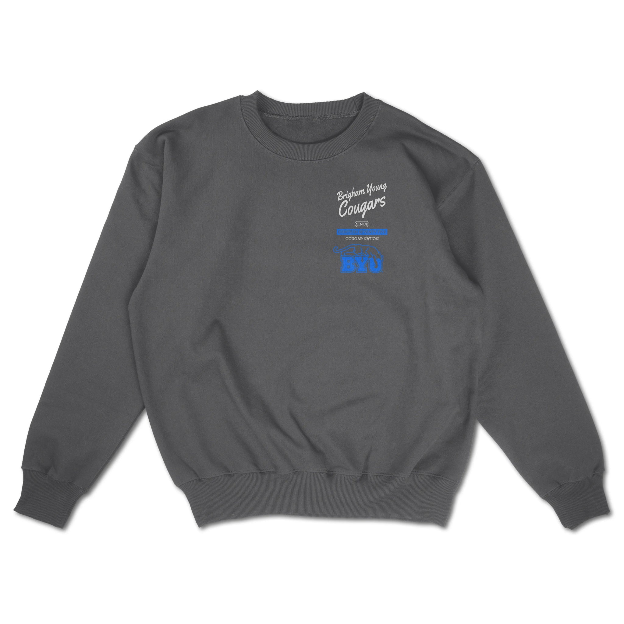Rep your roots and your team with the Hometown Pullover Crewneck — a staple piece that blends Cougar pride with everyday comfort. Crafted from premium heavyweight fleece, this crew delivers a soft, cozy feel built to handle game days, late nights, and everything in between. The classic athletic fit and bold front graphic make it a true statement for every BYU fan, while subtle design details nod to the spirit of Provo and the legacy of Cougar Nation.