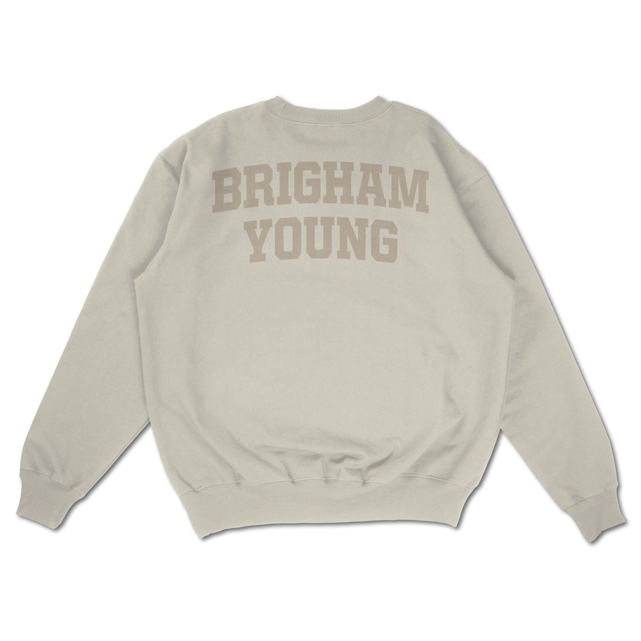 This ultra-soft, neutral colored sweatshirt is designed for layering and perfect for showing your Cougar pride all season long, into the winter months. Crafted from premium pre-washed, pre-shrunk cotton, it offers a lived-in vintage feel and relaxed oversized fit that makes it a wardrobe essential. The front features the official BYU Soccer crest, while the back showcases a tonal âBRIGHAM YOUNGâ arch that captures timeless collegiate spirit with a clean, modern edge in a sand-colored print.