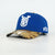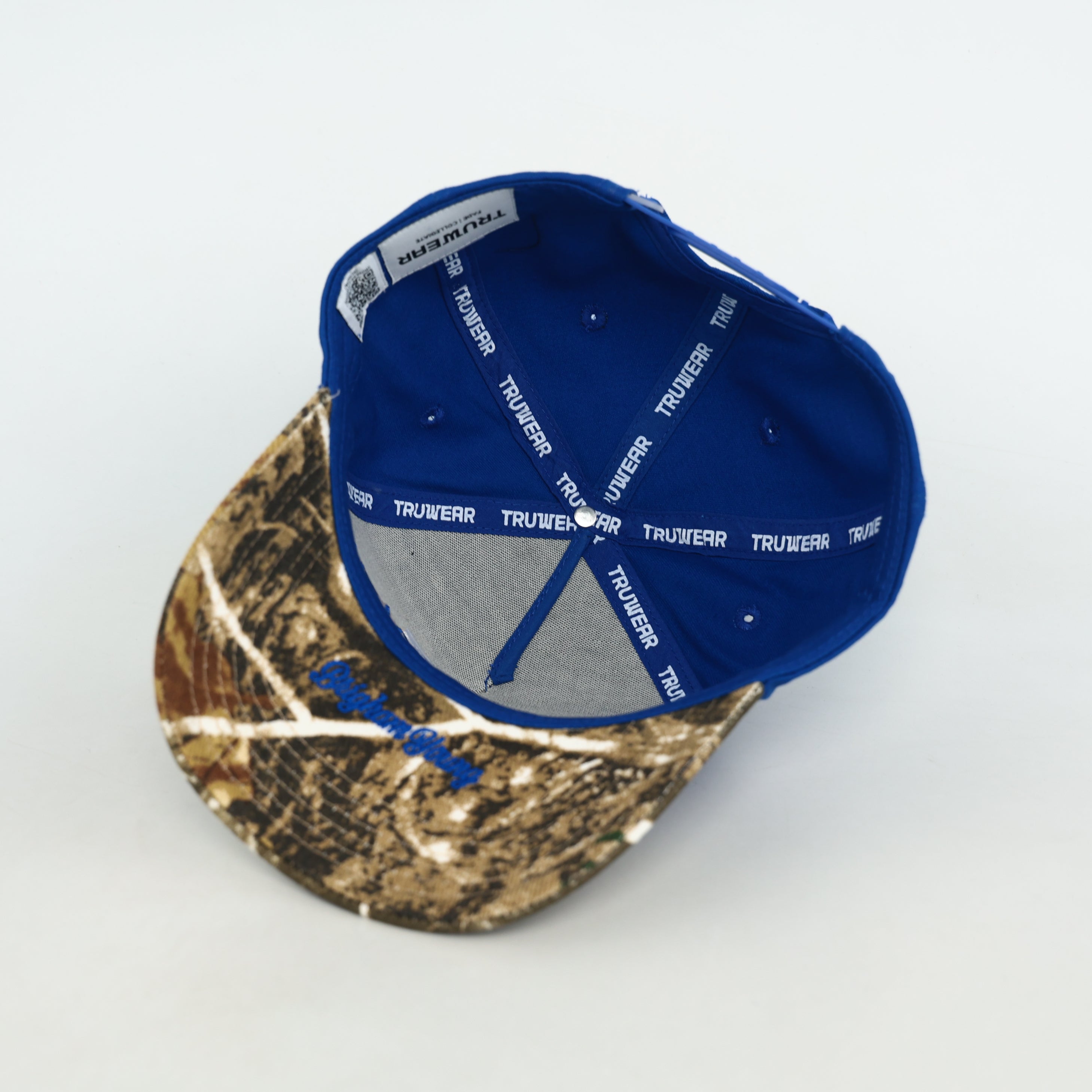 - Royal blue 5-panel crown with camo brim