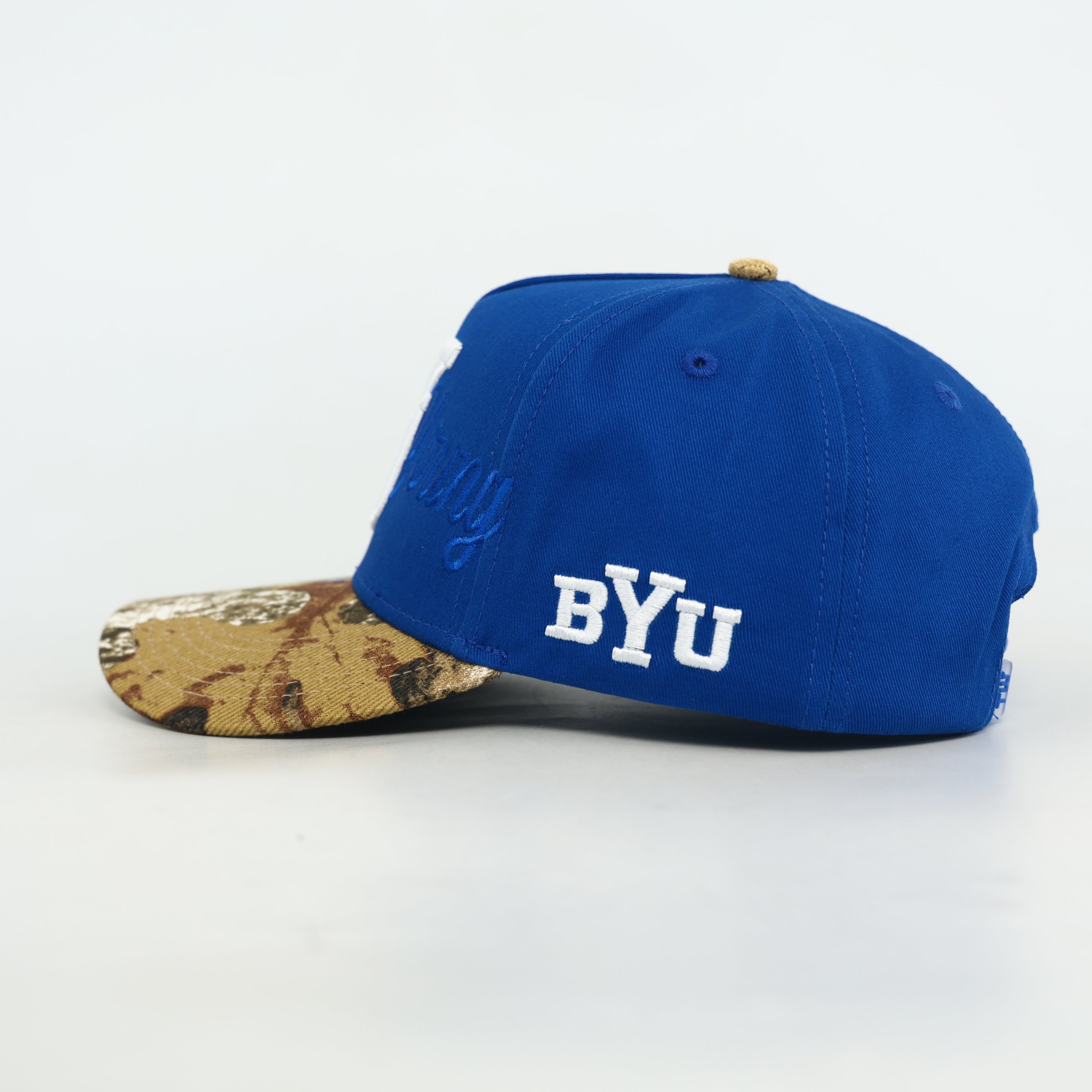 - Monochrome blue Brigham Young embroidery on the crown