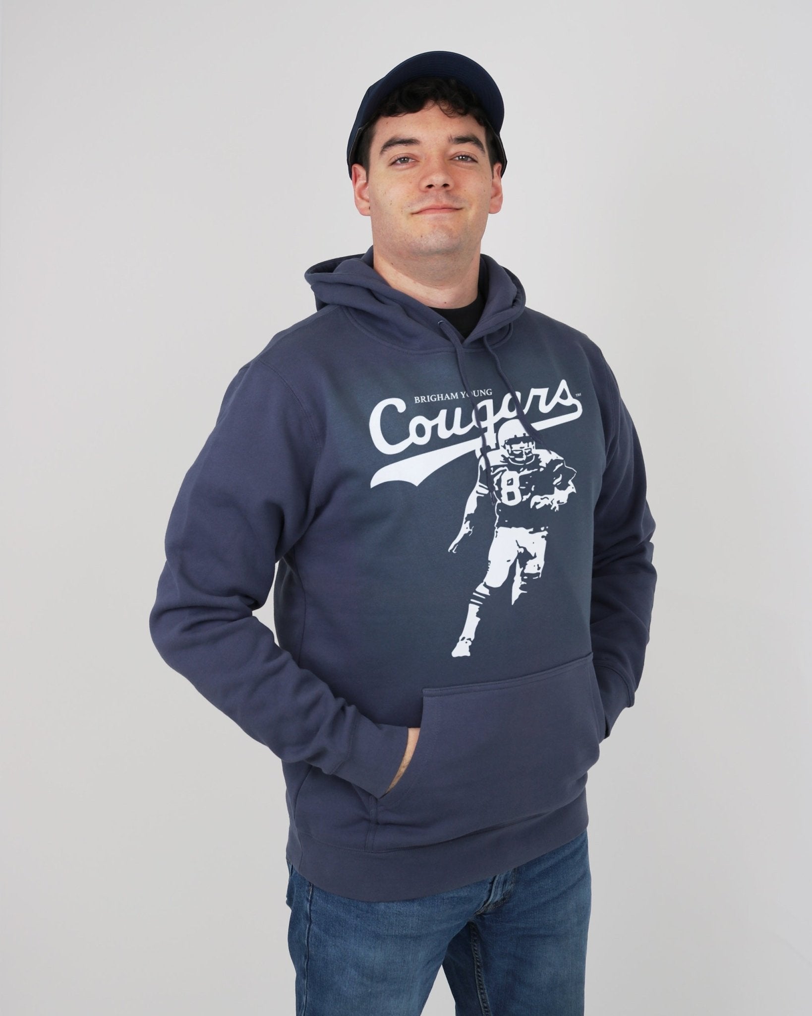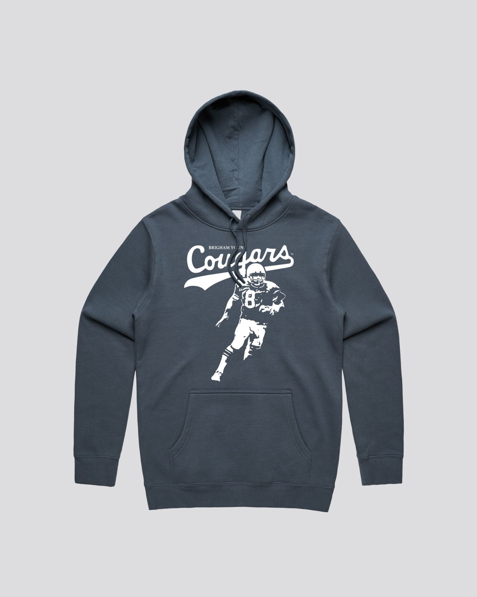 Your new go-to for cold game nights. The AS Colour Stencil Hoodie features a retro Steve Young graphic as an homage to BYUâs glory days and future wins.